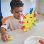Aproveitamos essa atividade para trabalhar cores e relacionamos com do semáforo , verde ,vermelho e amarelo. Reutilizamos materiais que seriam descartados ,caixa de papelão 3 escapamos para ficar alegres e lúdico. Desenvolvemos o treino motor , movimento de pinça. Atividade que traz conscientização do reciclar, reaproveitar e reutilizar.