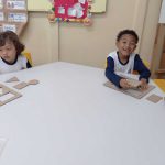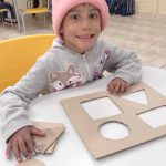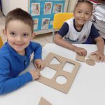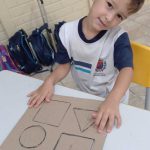 “Confeccionamos, com papelão, jogos de encaixe utilizando as formas geométricas, promovendo o reconhecimento das formas, a coordenação motora e a aprendizagem de maneira lúdica.