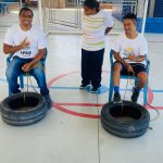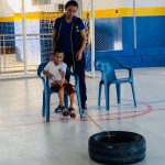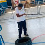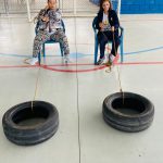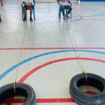 Os alunos foram incentivados a puxar o pneus amarrados com uma corda e só podiam puxar os pneus estando sentados na cadeira. A atividade foi feita em dois formatos, o primeiro em formato de competição para os alunos que possuem habilidades motoras e a atividades tinha início ao comando da professora, quem conseguisse trazer o pneu mais rápido vencia a competição. E para os alunos com comprometimento motor realizaram a atividade com auxílio físico e no verbal da professora. Atividade ocorreu nas aulas de educação física e com todas as turmas, adaptando e sendo realizada por todos os alunos da Instituição.