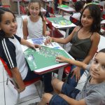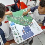 Desenvolvimento: As crianças se divertiram brincando com o jogo de tabuleiro sobre o trânsito (fornecido pela Arteris) que apresenta imagens de ações e placas de sinalização para trabalhar a percepção visual e os conceitos aprendidos sobre trânsito. O jogo é constituído de um tabuleiro e também das instruções de como jogar.