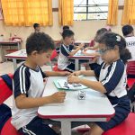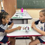 Os alunos do 2ºano confeccionaram o Jogo do Trânsito, composto por uma trilha simulando uma via de trânsito, carrinhos e um dado para aprender na forma de brincadeira sobre as regras para se obter um trânsito mais seguro. Após a confecção, se divertiram em duplas.
