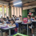 Os alunos jogaram o Jogo do Jota Quest, de 2 a 4 jogadores, cada jogador deve jogar o dado e andar as casas de acordo com o número sorteado e seguir as instruções de cada casa.