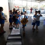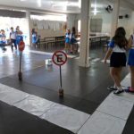 Em comemoração ao dia do pedestre, as crianças puderam jogar um jogo de tabuleiro feito no chão do patio da escola. Ele apresentou regras e sinalizações de trânsito. Os alunos utilizaram um dado para avançar ou recuar as casas do jogo. Todos participaram e gostaram muito.