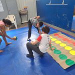 - Os alunos participaram do jogo, seguindo as instruções de mover mãos e pés para as cores sorteadas