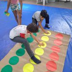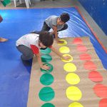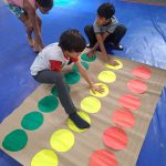 - Foi preparado um tapete de Twister adaptado com círculos nas cores do semáforo
