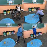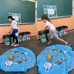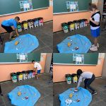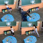 Logo após realizamos uma atividade prática em sala, onde encenamos um rio poluído com tnt azul, com diversos lixos no mesmo e uma criança de cada vez tinha que pegar um resíduo e descartar na lixeira correta.