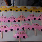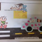 Confeccionamos um carrinho em papel para cada aluno, cada um colou sua foto no banco de trás do carro, simulando que o correto é criança no banco traseiro do carro com cadeirinhas ou assentos de elevação e cinto de segurança.