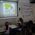 Dando continuidade ao projeto, os alunos realizaram a leitura do gibi da Turma da Mônica, edição Trânsito. Além da leitura, os alunos puderam acompanhar as imagens, através do uso da lousa digital.