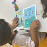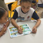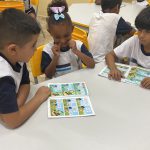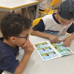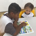 Distribuímos as turmas em duplas com alunos que são leitores e alunos que ainda não dominam completamente a leitura.
