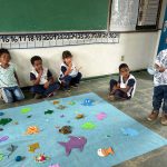 A professora da turma multisseriada, educação infantil, e 1° e 2°anos, proporcionou um cenário de rio com seres vivos convivendo com lixo. Eram seres aquáticos, como tartarugas, peixes, estrela do mar, polvo, arraias.