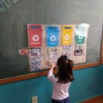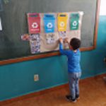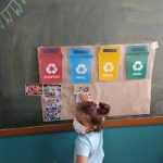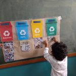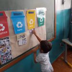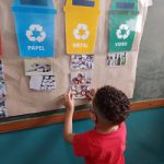 Crianças identificam as lixeiras coletoras e suas cores;