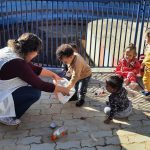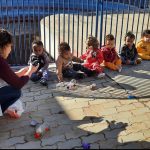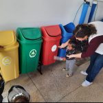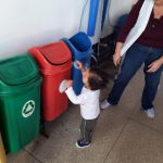 Objetivo: ensinar as crianças de maneira lúdica a colocar os lixos recicláveis em cada recipiente (amarelo,azul,verde e vermelho)Atentando- se a finalidade de cada um.Cada criança com a ajuda da professora de recebeu um lixo para descartar.