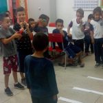 Realização de uma dramatização de um mini trânsito, com faixa de pedestre fixada no chão da sala, para os alunos que fariam o papel de pedestre, alunos com carrinhos e moto de brinquedo – simbolizando os motoristas e uma criança com semáforo confeccionado com EVA .