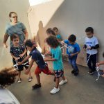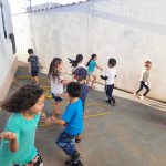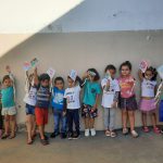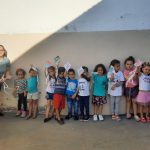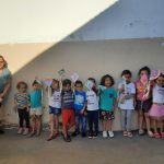 A professora narrou uma história sobre como é gostoso brincar com pipas, mas é uma brincadeira que exige muito cuidado sobre os lugares, a rede elétrica e também sobre a criminalidade da mistura de cola de madeira com vidro moído.