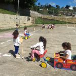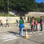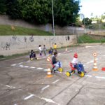 Na semana de 20 a 24 de Maio, os alunos de 4º e 5º ano montaram um percurso na quadra da escola, orientados pelo professor de educação física Danilo. O percurso tinha placas de contramão, faixa de pedestres, farol “humano”.