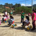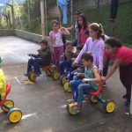 Os alunos menores da escola, de 4 a 7 anos, participaram do percurso, usando os triciclos da unidade. Durante o percurso, eles andaram na “cidade” montada pelos maiores, que faziam o papel de “guardas de trânsito”