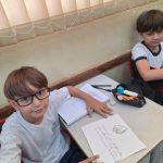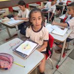 Na sala de aula confeccionaram o cartaz com a ajuda da professora.