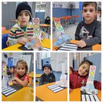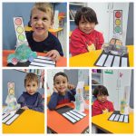 Após conversar com os alunos eles pintaram uma atividade, onde recortamos e colamos o pedestre, o carro e o sinaleiro no copo descartável, confeccionamos também a rua com a faixa de pedestre para eles brincarem.