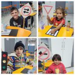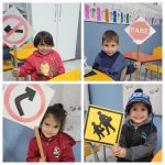 Levei para sala de aula algumas plaquinhas e conversamos sobre o que cada uma significa: PARE, PREFERENCIAL, VIRE À ESQUERDA, VIRE A DIREITA, ÁREA ESCOLAR, ETC.