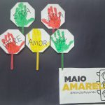 Nessa atividade a professora utilizou as mãos dos alunos pintadas com tinta das cores do semáforo para pedir mais respeito no trânsito.