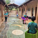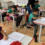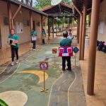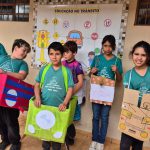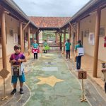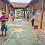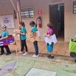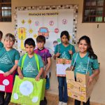 Atividade envolvendo conscientização no trânsito. Os alunos do 4º ano fizeram leitura de um texto informativo em sala, a professora explorou o texto sobre o tema. Em seguida, os alunos foram para o pátio com os carrinhos confeccionados com caixas de papelão na faixa pintada no pátio e realizaram a simulação do trânsito usando as placas.