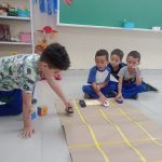 A turma do infantil 5° B A professora fez uma roda de conversa sobre as cores, depois os alunos puderam brincar no jogo do carrinho, na trilha a professora deu as seguintes Instruções, no qual dividiu a turma em dois grupos, escolhe um jogador de cada grupo, o qual representava o carro. Na sequência lançaria o dado para poder andar pela trilha. Se o dado caísse na cor verde o aluno estaria livre para andar uma casa, mas se caísse na cor vermelha o aluno teria que ficar parado, ou se o dado virasse na cor amarela o aluno ficaria de fora e perderia a vez. Vence o jogo quem caminhar por toda extensão da trilha. Nesta atividade os alunos utilizaram carrinhos simulando a vida real em diversas situações de trânsito.