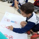 Nas turmas de 1º período – 4 anos A e 4 anos B, foram realizadas atividades de conscientização quanto ao trânsito e maneiras de como tornar esse fluxo cotidiano cada vez mais seguro. Dentre as atividades, estão abaixo anexadas fotografias da roda de conversa com as crianças , inserindo elas na literatura do trânsito: placas, sinalizações, gestuais de um guarda e a postura correta que motoristas e pedestres devem ter para um convívio de respeito mútuo. Após a roda de conversa, foi proposto às crianças que simulassem o cenário do fluxo em ruas, com pedestres e motoristas, levando em consideração os conceitos já aprendidos na roda de conversa. Inserindo ainda conceitos matemáticos, dentro de sala realizou-se a classificação de algumas placas de acordo com sua forma geométrica, fizemos uma competição para que as crianças “estacionassem o carro” no local correto de acordo com o comando ( frente, lado, atrás, em cima, em baixo), e como forma de fixação e finalização da semana de atividades, foi realizada a confecção de um mural, onde as crianças desenharam a rua, a faixa de pedestres, a calçada, pintaram os carros e desenharam os cenários em volta, inclusive os pedestres na calçada.