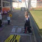 Simulação de uma rua: Montamos uma área de simulação com uma rua, faixa de pedestres, placas e sinalizações. Utilizamos materiais reciclados e velotrols como meio de transporte para as crianças se deslocarem na simulação. Enfatizamos a importância de respeitar as regras de trânsito, como parar nas faixas de pedestres e aguardar o momento seguro para atravessar.