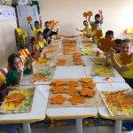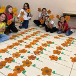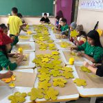 A professora confeccionou com seus alunos flores de papelão (reciclagem).