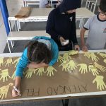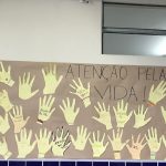 Os alunos desenharam a mão, como símbolo de pare para dar atenção à vida, em um papel amarelo e recortaram, após escreveram Atenção pela Vida e fizeram um cartaz par expor para a comunidade escolar.