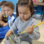 Em roda de conversa falamos sobre materiais recicláveis como garrafas pet, latas de leite, caixas e outros. Em seguida as crianças realizam pintura das latas com guache azul, amarelo e rosa, juntamente com a professora as crianças cortam as garrafas pet. Nessa atividade todas as crianças participaram com êxito.