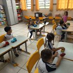 As crianças brincaram com carrinhos de brinquedo, enquanto uma delas mostrava as cores do semáforo, e de acordo com essas cores, as crianças ou paravam o carrinho, ou seguiam, ou iam devagar prestando atenção.