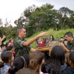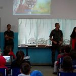 Recebemos uma palestra com policiais florestais, falaram um pouco sobre a preservação do meio ambiente e conservação. Além da palestra realizamos o plantio de algumas árvores nativas e a solturas de pássaros que foram aprendidos em cativeiro. Finalizamos com a confecção de porta lápis com embalagens recicláveis.