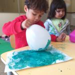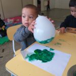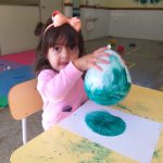 Descrição da atividade: Primeiramente as crianças pintaram a folha com a bexiga e tinta guache, em seguida a professora recortou em formato de círculo ( como se fosse o planeta) e por fim , juntos colaram o planeta na mão.