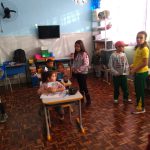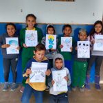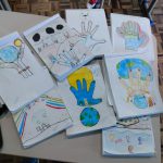 Também em sala de aula realizaram a construção de um desenho com o tema : Mãos que cuidam do meio ambiente , onde o objetivo do desenho era o símbolo das mãos e o meio ambiente.