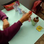 Utilizando copo descartável, cada aluno confeccionou suas lixeirinhas e