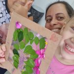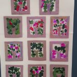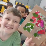 • Em sala de aula fizemos uma atividades usando recursos da natureza encontrados no chão, colhido pelos próprios alunos como folhas e flores, utilizamos papelão (material reciclado) para o molde na colagem das folhas coletadas no passeio.
