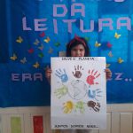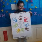Carimbaram as mãos em torno do desenho do planeta terra e coloriram um desenho do planeta terra ,dia mundial do meio ambiente 5 de junho.