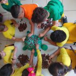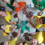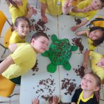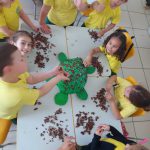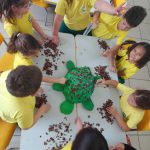 Alunos do pré II na produção da tartaruga com material reciclável.