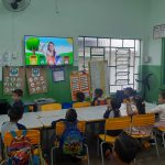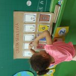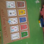 As crianças assistiram a um vídeo informativo sobre a coleta seletiva. Em seguida, cada uma recebeu a imagem de um tipo de lixo para colorir e recortar. Com essas imagens, confeccionamos um cartaz coletivo da coleta seletiva, no qual cada criança cola seu desenho na lixeira correspondente, observando a cor adequada de cada recipiente.