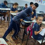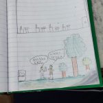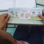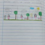 Trabalhando com o gênero textual “tirinha”, abordamos um texto onde o assunto principal é a reciclagem de sucatas, reutilização me materiais para montar brinquedos. Foi um momento onde os alunos relembraram os brinquedos que já montaram anteriormente, um momento rico em troca de ideias e conversa sobre o que cada um faz em casa para contribuir para a essa reciclagem e, com isso a preservação do meio ambiente. Para concluir a aula do dia, os alunos fizeram tirinhas onde escreveram e desenharam representando os cuidados e ações que fazem em seu dia a dia para cuidar do meio ambiente.