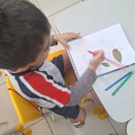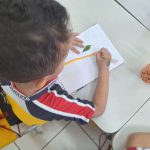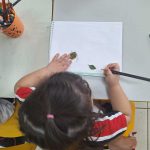 Em atividade anterior, as crianças coletaram elementos naturais caídos no chão da escola e com esse material tiveram o desafio de praticar o olhar para além do convencional e fazer desenhos diversos, tendo de utilizar o elemento natural como base para o desenho. Por exemplo: uma folha se transformar no desenho no corpo de uma tartaruga e tendo de completar o desenho e o cenário de sua maneira.