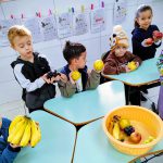 Com os alimentos saudáveis listados na lousa preparamos uma receita de salada de frutas com a ajuda dos alunos. Alguns descascaram, outros picaram e também adoçaram com suco de laranja a salada. Todos comeram e repetiram. Novamente reforçamos a ideia de plantar, cuidar, colher e alimentar-se de forma saudável.