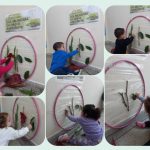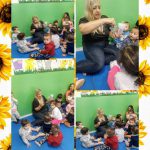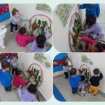 As professoras organizaram um momento lúdico sobre meio ambiente e reciclagem, adaptado para crianças da creche. A sala foi preparada com caixas coloridas representando as lixeiras de coleta seletiva (azul, vermelho, verde e amarelo). Os objetos utilizados eram materiais limpos e seguros, como garrafas PET, tampinhas, caixas de papelão pequenas, potes plásticos e revistas.