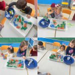 Depois da exploração, as professoras incentivaram a brincadeira de colocar os objetos nas caixas coloridas, nomeando cada cor e explicando que cada material tinha um “lugar certo para morar”. As crianças, mesmo sem compreender totalmente a regra, participaram ativamente, colocando objetos nas caixas, com auxílio das educadoras.