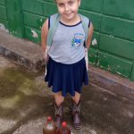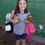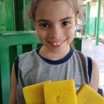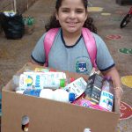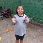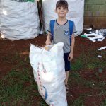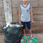 Texto: A escola, os professores, funcionários e alunos coletam materiais como óleo, lacres e pilhas que não devem ser descartados em lixos comuns e em parceria com outros órgãos faz o reuso do óleo na produção de sabão e o descarte das pilhas e lacres em recipientes apropriados, evitando a contaminação do solo que aconteceria caso fossem descartados no lixo doméstico.