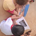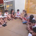 Em seguida, foi contada a história de um peixinho que ficou triste porque o rio estava poluído, estimulando a imaginação e a empatia das crianças. Após a conversa realizamos uma dinâmica, onde as crianças foram para o lado de fora da sala onde tem um espaço aberto que estava cheio de lixos; como plásticos, vidros, alumínio, papéis e papéis higiênicos, as crianças foram divididas em grupos e foram recolhendo todo o lixo que estava poluindo a natureza.