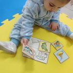 Após uma roda da conversa sobre cada meio de transporte, apresentei um jogo que estimula a percepção visual e eles colocavam cada figura em seu respectivo lugar. Depois da atividade, fiz a leitura do livrinho “Pedrinho, o trator”.