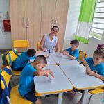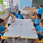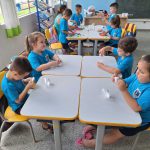 Em sistema de rodízio todos os alunos passaram por todos os grupos, a professora acompanhou e orientou o grupo no plantio de feijão, mediando cada passo, inicialmente, os alunos colaram suas etiquetas de nome no copo de plástico, afofaram o algodão, acomodaram seus grãos de feijão, regaram e disseram boas palavras incentivando o crescimento.
