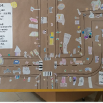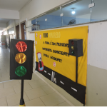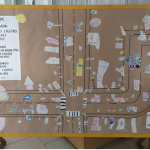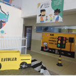 Foi realizado com os alunos do 1º ano pela professora Renata, painel representando as diversas formas de ocorrências no trânsito. O painel ficou muito legal, bem representativo. Tiveram o cuidado de colocar as situações que ocorrem diariamente, quais as providências corretas. A professora trabalhou a letra de um Música, Biii… Biii…FonFom….